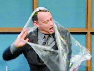 奧斯卡影帝湯姆·漢克斯5月16日在紐約做客《周六夜現場》節目。在節目中,湯姆·漢克斯被主持人威爾·法瑞爾惡搞,被套上了一個超大塑料袋,幾次掙扎后,這位影帝的俏臉都險些變形,最終還是撕破袋子獲釋。但惡搞只是節目的一部分,等湯姆·漢克斯平靜之后,他還在節目中與女星安妮·海瑟薇共同表演薩克斯。其實上電視,只是漢克斯忙里偷閑的一次放松,近期他的主要任務是為新片《天使與魔鬼》作宣傳,該片是《達·芬奇密碼》續集,在片中他依舊飾演哈佛教授羅伯特·朗頓。