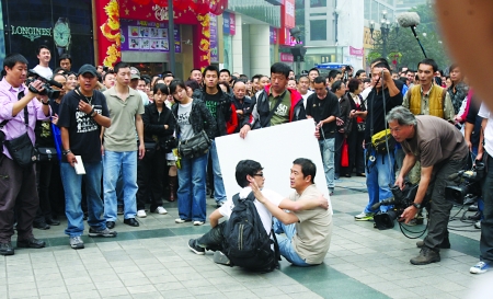 上午10點10分,記者趕到現場時,解放碑下已經聚集了數百群眾,不少人正在熱烈討論:“費力抓到個小偷,結果是在拍戲嗦。”原來,昨天的戲份是扮演張國立舞蹈老師的韓雨芹正在逛街,錢包被小偷偷了,“暗戀”老師的張國立發現后,奮勇抓住了小偷。一位工作人員告訴記者,一開始拍攝的是遠景,出場的是身著張國立同樣服裝的替身演員,為求真實,攝影機和工作人員都離得比較遠,現場非常不好控制。記者看到,每當替身演員大喊抓小偷時,本該由扮演路人的演員出場一起圍抓小偷,誰知總有不少路人以為真有“小偷”,上百人一擁而上,還有的出手打“小偷”,導演不得不數次叫停,最后連張國立都上前來營救“小偷”。