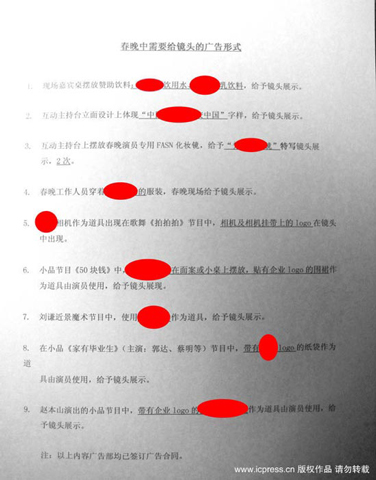 新民網3月2日報道 2010年3月1日,北京,央視虎年春晚廣告植入清單曝光,列出內容次數、注明已簽合同,春晚當天需要給鏡頭的廣告形式都一一羅列,包括飲用水、化妝鏡、服飾、相機、酒等名目繁多。