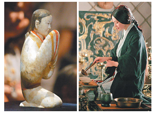 相較于歷史博物館“微笑彩俑”展里的跽坐拱手俑,葉錦添分析,林志玲在《赤壁》里的發型和服裝都與拱手俑相仿,優雅的跽坐美姿讓它化為永恒。