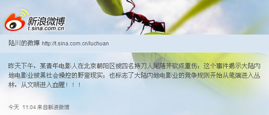 9日上午11時04分,導演陸川在微博稱:“昨天下午,某青年電影人在北京朝陽區被四名持刀人尾隨并砍成重傷!标懘ㄟ在微博中分析,懷疑此事和某些黑勢力有關。他還表示:“這個事件標志了大陸內地電影業的競爭規則開始從筆端進入叢林,從文明進入血腥。!”