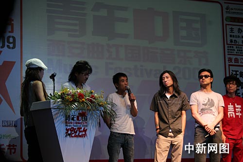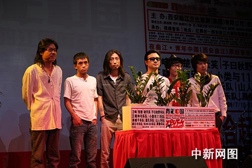 中新網(wǎng)7月2日電(楊洋) “青年中國(guó)(西安曲江)國(guó)際音樂(lè)節(jié)——2009新聞發(fā)布會(huì)暨青年音樂(lè)發(fā)展計(jì)劃啟動(dòng)儀式”于7月2日在京舉行。汪峰、張楚、謝天笑等知名音樂(lè)人到場(chǎng)助威,現(xiàn)場(chǎng)氣氛火爆。本次音樂(lè)節(jié)將于7月10日在西安曲江開(kāi)幕,是國(guó)內(nèi)第一個(gè)時(shí)尚視覺(jué)音樂(lè)節(jié)。