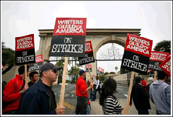 最近,洛杉磯真是不太平。不久前,山林大火燒了一個多星期,至少造成15億美元的損失。本月5日,好萊塢劇作家們又在工會的領(lǐng)導(dǎo)下,開始在全美國罷工。這是20年來的第一次劇作家罷工,在美國各界引起相當(dāng)大的反響。這些平日深鎖家中爬格子,難得露面的好萊塢劇作家們,一大早聚集在八大影業(yè)公司以及迪斯尼總部的攝影棚外,他們高舉標(biāo)語牌,聲稱這次對“電影暨電視制作人聯(lián)盟”展開的罷工,將會是一場持久而代價昂貴的行動。電視屏幕上馬上就有了反映,一些電視臺開始播放老舊的內(nèi)容。當(dāng)然,作為同行,演員、主持人、脫口秀主持都非常支持編劇們,到現(xiàn)場慰問,并且在自己的節(jié)目中聲援罷工。