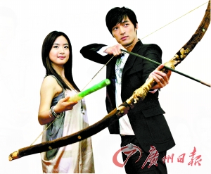 胡歌手持彎弓,林依晨手握打狗棒,在發布會現場“顯露”武功。