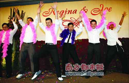 而新郎馬偉豪為了這場婚禮花了不少心思,除了以電影的形式記錄戀愛過程外,還瞞著新娘專門和兄弟們排演了一場“艷舞”在婚宴上表演,就為給新娘一個大大的驚喜?粗靶●R哥”在臺上扭腰挺胯搔首弄姿做出一個個“嫵媚”的姿勢,新娘和嘉賓都笑得前仰后合。這場婚宴從晚上6點半一直持續到深夜近12點,賓主才盡興而歸。