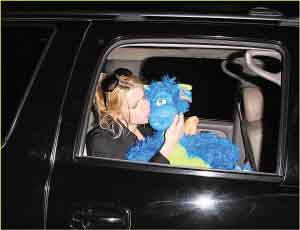 莫非杰西卡·辛普森用這個藍色公仔代替了男朋友托尼·羅莫?瞧她那又?jǐn)堄钟H的親熱勁,童心十足。