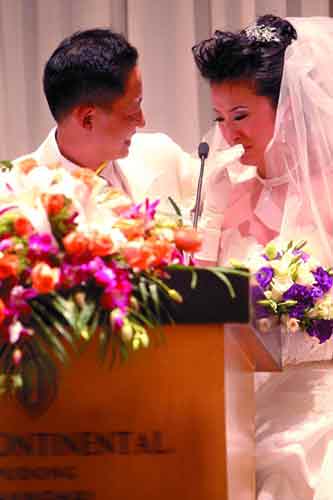 下午6點(diǎn),婚禮正式開始。據(jù)現(xiàn)場(chǎng)記者透露,王志文和陳堅(jiān)紅穿著西服和婚紗踏上了紅毯,在婚禮進(jìn)行曲中走上舞臺(tái)。著名導(dǎo)演田壯壯擔(dān)當(dāng)證婚人,當(dāng)王志文深情地對(duì)著新娘陳堅(jiān)紅說:“很愛你!”時(shí),陳堅(jiān)紅不禁淚灑現(xiàn)場(chǎng),兩人深情舉起香檳,喝了交杯酒。整個(gè)儀式只舉行了15分鐘,很簡單,但是很溫馨,現(xiàn)場(chǎng)一位賓客說:“我們都能感受到王志文對(duì)陳堅(jiān)紅的愛。”
