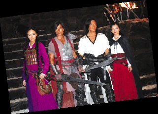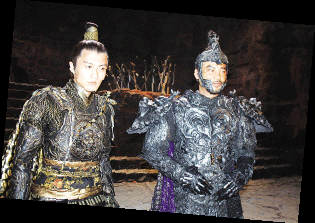 走進一間已經被布置成刑房的攝影棚,巖石碎塊構成了粗糙的地面,幾把劍插成了劍壇,臺階上火爐冒著火苗,空中還懸著幾塊爬著蟲蛆的火腿,幾臺鼓風機正開足馬力吹著風……看前面,一堆人正在你推我一把,我攻你一招,原來替身正在幫任達華試戲。對披著長發造型的鄭伊健、郭富城以及何家勁來說,炎熱恰是專門跟耍帥作對的。問到郭富城對于造型的看法,郭富城當即冒出一句“非常熱”。現場汗流浹背的阿Sa抱怨說,飾演聶風的鄭伊健可謂是片中最舒服的一位,不僅戲服相對清涼,由于名為“風”,因此拍戲的時候可以充分享受鼓風機的待遇。
