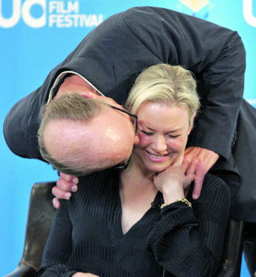 芮妮·齊薇格(右)前日出席多倫多影展記者會(huì)時(shí),意外被該片監(jiān)制兼演員的艾哈里斯突襲偷吻,令伊人笑得十分尷尬。