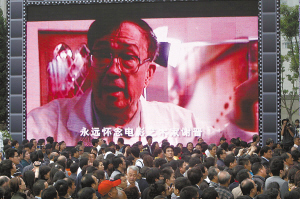 龍華殯儀館的大廳外掛著四幅謝導(dǎo)的大型肖像,都是謝導(dǎo)生前工作生活時(shí)的日常照,另外一邊高達(dá)四米的巨型屏幕則不斷播放著《紅色娘子軍》、《天云山傳奇》等謝導(dǎo)生前作品的片段。影迷們駐足其下,回憶著謝晉帶給他們的感動(dòng),久久不愿離去。