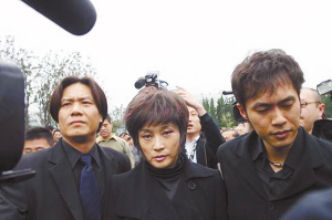 沒有主持人,沒有悼詞。中午1時(shí),謝晉的遺孀徐大雯、智障的小兒子阿四在家屬的攙扶下,走進(jìn)了靈堂。雖然眼睛紅腫,但徐大雯依舊是昂著頭走進(jìn)靈堂的,目光一直望著大廳上方謝晉的遺像。隨后,影壇各界人士相繼到來,紛紛表達(dá)了各自的哀痛。成龍、陳凱歌、周迅等大腕雖然沒有到場(chǎng),但也送來了花圈。