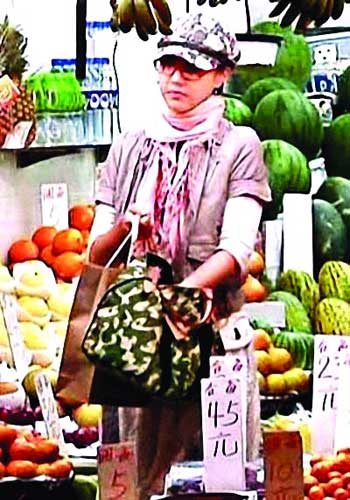 不知道她這身莫名其妙的打扮是否過分“獨特”,身旁一名女子也不禁打量她,但周海媚不予理會。之后周海媚再到附近一間水果店買櫻桃(右圖),付款后,她邊走邊把櫻桃放進手袋內離開。