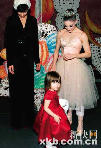 周日,凱蒂·霍爾姆斯帶著打扮似小公主的蘇瑞一起去紐約芭蕾舞團觀看劇目《胡桃夾子》,并在后臺和芭蕾舞演員合影留念。