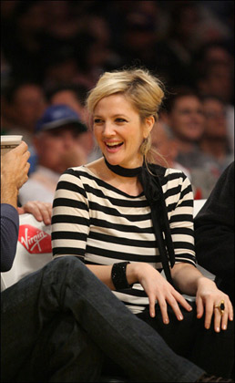 最近心情大好的德魯·巴里摩爾回到了洛杉磯,頭一件事情就是去觀看了洛杉磯湖人的NBA比賽,賽場的德魯·巴里摩爾不時開懷大笑。當晚的裝扮更是讓人看著舒服的同時,星味十足,條紋寬肩上衣配黑色圍巾,黑色仔褲黑色高跟鞋,青春洋溢,實在好看。