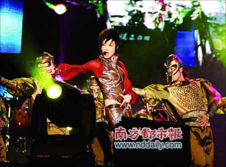 壓軸的李宇春一出場(chǎng)就聲勢(shì)浩大。煙火四射,黃色氣球簇?fù)碇黄鹕欤钣畲涸邶嫶蟮陌槲鑸F(tuán)開路下殺到,滿場(chǎng)歡呼。大家一起和應(yīng)《我的王國》、《HappyHour》、《冰菊物語》和《kulala》,顯現(xiàn)李宇春依然是天娛一姐的地位。(記者 何穎珊)
