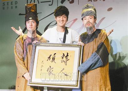 因為與“詩”有關,在昨日的發布會上,最先上場的不是主角吳克群,而是“穿越時空”前來捧場的中國古代先賢:最著名的大詩人“李白”、“杜甫”。在現場所有人的驚呼聲中,兩位年輕演員所扮演的大詩人,卻顯得心神不定,他們鋪墊說:“得知今天有一位學貫古今、又能寫詩、又能唱歌的當世才子即將到來。”這時,吳克群才現身,并為兩位詩人解開了疑惑,還慨然應允“李白”、“杜甫”來考驗他,即興將兩位詩人的名句用吉他彈唱出來。吳克群的才華讓兩位“先賢”頻頻點頭,并當場宣布吳克群為“詩人頑家”并送上金匾。