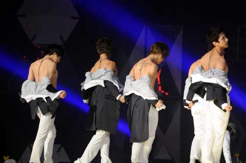 29日下午,“2008 SBS歌謠大典”在京畿道一山國際展覽中心(KINTEX)進行了現場直播。節目當天,東方神起在上臺演唱熱門歌曲《咒文》(MIROTIC)時,在結尾處齊齊脫去上衣亮出了有型背肌,引得現場粉絲尖叫連連。