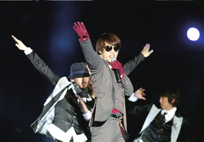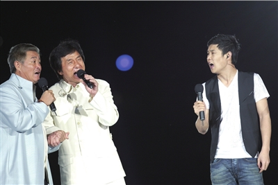 昨晚的演唱會嘉賓云集,舞臺設置也頗有陣勢,在中心舞臺的四周分設了6個舞臺。晚7點半,《龍的傳人》前奏響起,成龍身穿白衣擊缶登場,與所有的演出嘉賓合唱一首《龍的傳人》。