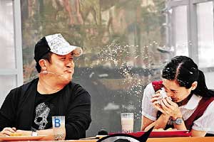 中新網10月22日電 據《新明日報》報道,香港無線電視最近在臺灣為《味分高下》終極篇錄影,昨日在臺北小巨蛋門前拍攝!丢勯T人》主持人曾志偉絲毫不懂憐香惜玉,喝珍珠奶茶時,居然將牛奶茶噴得郭羨妮滿頭都是。郭羨只能強顏歡笑,十分狼狽。