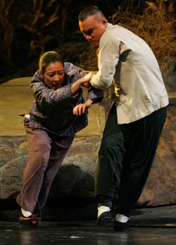 資料圖:著名演員梁冠華以一位外號“狗兒爺”的形象演出話劇《狗兒爺涅槃》。 中新社發 滿會喬# 攝