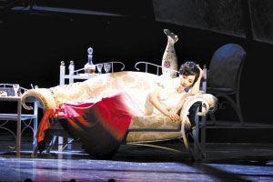 對此,導演王延松表示,“鳥巢”并不新鮮,倒是由一端底處逐漸盤旋上升到另一端中高處的一長段樓梯形成的“腰線”比較特別,是一個原創。演出中,陳白露經常要在這段樓梯跑上跑下,為整部《日出》穿針引線。華麗場景與三等劇院的變換,也巧妙地利用了帷幔、燈光,用燈光下映襯在幔布上的演員的剪影與舞臺上演員的身影,相互呼應、巧妙相連。