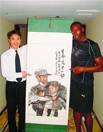 牙買加飛人博爾特在奧運會百米決賽中以9秒69震驚世界,昨日記者獲悉,博爾特與山東濟寧的一位農民畫家還有一段小故事——— 奧運開幕前夕,博爾特隨牙買加體育代表團在天津訓練時,濟寧畫家房貽德特意托人向博爾特贈送了一幅抗震救災題材國畫,博爾特欣然接受,并回贈了一件他的簽名運動服。