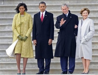 而作為離任的總統布什與勞拉的著裝讓人矚目,尤其是勞拉選擇素雅的淺灰色套裝,非常完美的展現了她柔和、高雅的氣質,而簡潔的款式與剪裁讓她看上去非常平和,似乎預示著她離去前平和的心態。
