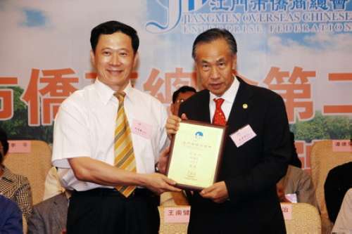 王南健等向新當選的理事會成員頒發了證書。廣東省僑辦副主任陳仰豪對僑商總會成立三年來所取得的成績和自身發展給予充分肯定。江門市委副書記譚繼祖代表市委、市政府對僑商總會和廣大僑商為江門市經濟社會發展所做出的貢獻表示衷心感謝;并指出,市僑商總會自成立以來,秉承“為會員服務、為經濟建設服務、為社會服務”的宗旨,在加強內外溝通、以商引商、應對國際金融危機、為僑資企業排憂解難、支持僑鄉慈善公益事業等方面,做出了大量卓有成效的工作,衷心希望僑商總會與各位僑商朋友繼續大力宣傳推介江門的投資環境,吸引更多的僑商到江門投資興業和經貿洽談。