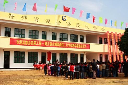 陸川縣古城鎮清耳二片村,有人口8000多人,既是革命老區,又是庫區,人多田少,村民主要靠去廣東打工謀生,生活水平較低。二片分校是一所完全小學,有學生350人,教師13人,原有教室是上世紀六十年代修建,部分桁條腐朽,漏風漏雨,現狀堪憂。今年2月18日,廣西自治區僑辦副主任鐘志英一行考察了該校,并積極向海外慈善基金會推介,成功獲得香港道德會無償捐贈32萬元。教學樓總投資82萬元,香港道德會無償捐贈32萬元,地方政府配套50萬元,于6月4日動工建設,11月初完工。同時配套建設籃球場、水井、衛生間、校門,使學校舊貌換新顏,成為陸川縣功能齊全、設施一流的小學。