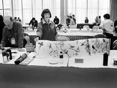 國際友人對筆會也是情有獨鐘。來自澳大利亞的博理查和宣月,已跟中國老師林伯墀學中國畫達10年之久。林老師讓宣月不但學中國畫,還要學更多的中國文化。她這次來想通過參與交流,開闊視野,取長補短,使自己的繪畫藝術再上一層樓。她還高興地展示了自創的花鳥畫集,并和博理查向藝術節敬獻了現場創作的“鮮花綻放圖”和“袋鼠翹首觀望圖”。來自美國西雅圖的畫家,把自己創作的一幅長達十幾米、影響類似中國《清明上河圖》的《西雅圖美景》大畫贈給了華人文化藝術節組委會,感動了在場的海內外僑胞。