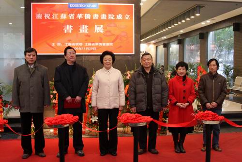 會后,舉辦了慶祝江蘇省華僑書畫院成立書畫展開幕式。張艷、黃因慧、郁美蘭、史宇、趙緒成、朱道平為書畫展開幕式剪彩。