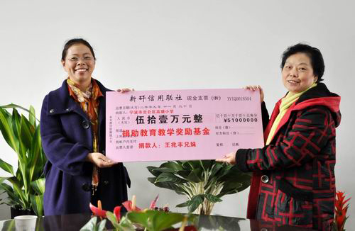 中新網(wǎng)12月3日電 據(jù)浙江僑聯(lián)網(wǎng)消息,11月30日上午,已故浙江省北侖籍港胞王兆豐先生的大兒媳唐秀娟女士代表王氏家族把祖屋拆遷的賠償款51萬元親手交給了新碶街道高塘小學(xué)校長唐亞云的手中,用于設(shè)立“王兆豐兄妹教育教學(xué)獎勵基金”。至此,這件長達10余年的捐贈事宜終于畫上了圓滿的句號。寧波市北侖區(qū)教育局局長胡小偉、新碶街道辦事處主任徐孟杰、區(qū)僑辦副主任姚慧貞、新碶街道黨工委委員林雪鳳出席基金成立儀式。新碶街道辦事處副主任李國東主持儀式
