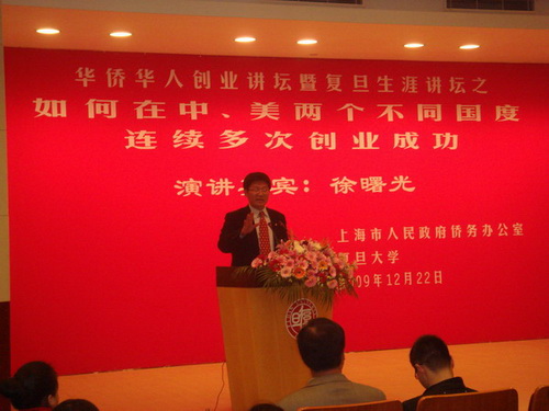 中新網12月31日電 據上海市僑辦消息,12月22日晚上,上海市復旦大學光華樓102報告廳里座無虛席,由上海市僑辦與復旦大學共同主辦的“華僑華人創業講壇”第四講活動舉行。