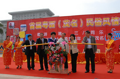 中新網(wǎng)2月24日電 據(jù)茂名外僑局消息,2月23日,廣東省茂名市在市文化廣場(chǎng)隆重舉行首屆粵西(茂名)民俗風(fēng)情旅游節(jié),同時(shí)啟動(dòng)“春游粵港·三八同樂(lè)”和“廣東2010年華人華僑旅游年·相約茂名”活動(dòng)。茂名市人大常委會(huì)常務(wù)副主任宋壽金,廣東省僑辦副主任林琳,廣東省旅游局副局長(zhǎng)王志紅,茂名市市委常委、副市長(zhǎng)林日娣,市政協(xié)副主席章寧,茂名市外事僑務(wù)局局長(zhǎng)梁紅健及美國(guó)茂名同鄉(xiāng)會(huì)會(huì)長(zhǎng)郭嚴(yán)芳先生等領(lǐng)導(dǎo)和各界來(lái)賓約600人出席了活動(dòng)。