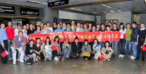 當天在中國駐圣保羅總領事孫榮茂,巴西華人協會會長吳耀宙及各位僑領的帶領下,當地的僑胞們來到國際機場迎接藝術團,大家都手握國旗,拉著大橫幅,滿懷激情的等待著,當藝術團演員們出現在大家眼前時,許多熟悉的面孔都掛滿了笑容,僑胞與藝術家們相擁著,互相問好。