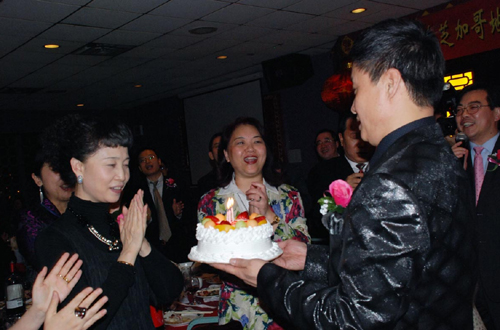 在歡迎宴會上,許又聲在總領事黃屏陪同下,向參加宴會的每一桌僑胞一一敬酒,向大家致以親切問候。來賓們和閻維文、夢鴿、陳軍、劉珂、雷佳、劉小娜等藝術家們爭相合影,歡聲笑語不斷。當天正值閻維文的夫人劉衛星生日,大會特地準備了生日蛋糕,全場合唱“祝你生日快樂”。閻維文也清唱一首“在那遙遠的地方”來感謝大家,受到熱烈的歡迎。