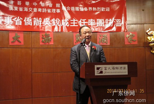 宴會上,中華會館等主要社團的負責人、海外理事代表紛紛做了熱情洋溢的歡迎辭,對廣東省僑辦主任吳銳成一行務(wù)實、深入、高效、不辭勞苦的工作表示由衷的欽佩和贊賞。吳銳成在發(fā)言中感謝僑胞們對訪問團的熱情接待和大力支持;向僑胞們詳細介紹了這次訪問的目的,一是向僑胞們拜年,二是報告中國特別是廣東的社會經(jīng)濟發(fā)展情況,三是感謝僑胞們對中國以及廣東發(fā)展所作的貢獻,四是聽取僑胞的意見;再次表示今后廣東省僑辦要在關(guān)注華僑華人生存發(fā)展、維護華僑華人合法權(quán)益、支持社團的革新與發(fā)展、支持華僑華人融入主流社會、支持華社開展華文教育、傳承中華文化等方面做更多的工作。吳銳成務(wù)實為僑、熱情洋溢的精彩發(fā)言得到了共鳴,贏得了陣陣掌聲。