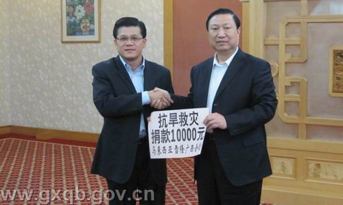 3月26日,馬來西亞雪隆廣西會館和泰國廣西總會永遠名譽會長饒培中到訪廣西,馮祖華接待了到訪的客人,向他們通報了廣西的旱情,馬來西亞雪隆廣西會館和泰國廣西總會永遠名譽會長饒培中當即分別向廣西災區捐款一萬元和一千元。