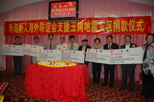 中新網4月30日電 據珠海僑務局消息,地震災情牽動著億萬中國人民的心,也受到珠海海外聯誼會的潮商們的高度關注。為積極支持玉樹的災后重建工作,繼08年汶川大地震該會捐資40萬元支持綿虒鎮涂禹山村重建格子巖組“僑心村”后,珠海潮人海外聯誼會又于4月27日舉辦現場捐款活動,呼吁珠海的廣大潮商伸出援手,募捐善款,幫助地震災區同胞,抗震救災、重建家園,為抗震救災行動貢獻一份力量。廣東省珠海市政協副主席、市委統戰部部長羅碧堅、市僑聯主席李清出席了捐贈儀式。