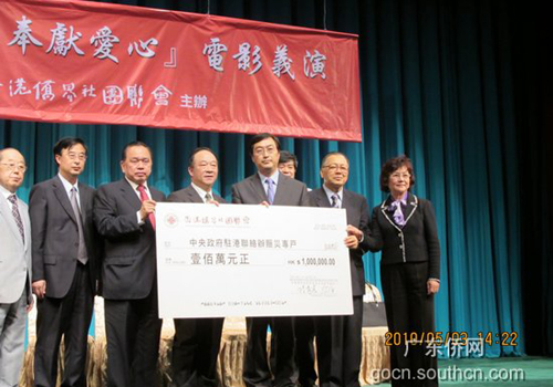 中新網5月6日電 據廣東僑網消息,5月3日,香港僑界社團聯會舉行“情系玉樹 奉獻愛心 電影義演”暨向玉樹地震災區捐款儀式,廣東省僑辦主任吳銳成應邀出席并講話。