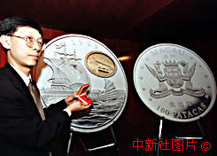 澳門貨幣暨匯兌監(jiān)理署三十日發(fā)行一枚澳門回歸紀念銀幣,這是該署為紀念澳門特別行政區(qū)政府於九九年十二月二十日成立之系列紀念幣中的第一組。銀幣面值一百圓澳門幣,重一盎司,為澳門法定貨幣,售價六十八美元或五百二十五港幣。