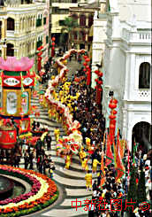 澳門十七日(農歷年初二)舉行舞獅、舞龍賀新年活動。由百余人舞動的一百多米長金龍行過街道,慶賀新年到來。