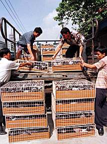 象征1999年的1999只信鴿將于九月九日在澳門的大三巴牌坊前放飛返回廣州。這項名為“信鴿競翔報歸訊”的活動,將揭開九月十一日澳門回歸祖國倒計時一百天紀念活動的序幕。圖為廣州市信鴿協會正將征集的信鴿運往澳門。