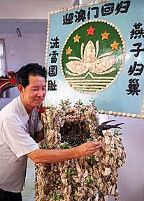 浙江省玉環(huán)縣水族工藝館原館長(zhǎng)鄭高金,最近用一千五百多只貝殼創(chuàng)作了一件迎澳門(mén)回歸的貝雕作品「燕子歸巢」。