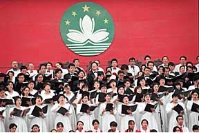 天安門(mén)廣場(chǎng)迎澳門(mén)回歸100天大型音樂(lè)會(huì) 作者:鄒憲 北京十五家文藝團(tuán)體十日下午在天安門(mén)廣場(chǎng)舉行“迎澳門(mén)回歸倒計(jì)時(shí)一百天大型音樂(lè)會(huì)”。來(lái)自香港、澳門(mén)和內(nèi)地近千名歌唱家在澳門(mén)特區(qū)區(qū)徽下高歌《歡樂(lè)頌》。 |