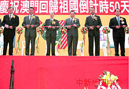 澳門各界三十一日在澳門友誼廣場舉行慶祝澳門回歸倒計時五十天活動,全國政協副主席、澳門各界慶祝回歸活動委員會主席團主席馬萬祺(左三)、澳門特別行政區首任行政長官何厚鏵(左二)、新華社澳門分社社長王啟人(左四)等嘉賓為慶祝活動剪彩。