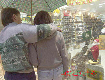 澳門一家商店特意讓圣誕老人玩具手握特區(qū)區(qū)旗歡迎回歸,引起一對情侶的好奇。