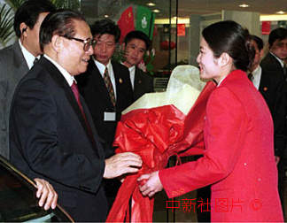 江澤民主席十九日中午抵達下榻的澳門濠景酒店,受到工作人員的熱情歡迎。 中新社傳真 毛建軍攝