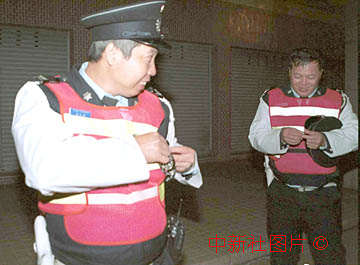 負責澳門政權交接大典交通引導職責的澳門治安警察廳交通科警員在二十日零時更換警標。中新社傳真 陳佳攝