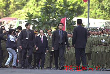 國(guó)家主席江澤民二十日在澳門參加回歸慶典中,來到剛剛進(jìn)駐澳門鬧市里的解放軍軍營(yíng),檢閱未洗征塵的三軍將士。 中新社數(shù)碼傳真 毛建軍 攝